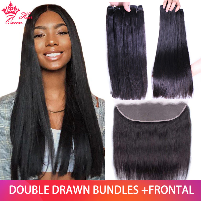 Double Drawn Virgin Human Hair Bundles With Frontal Brazilian Bone Straight Hair Extensions 13x4 Lace Frontal With Bundles